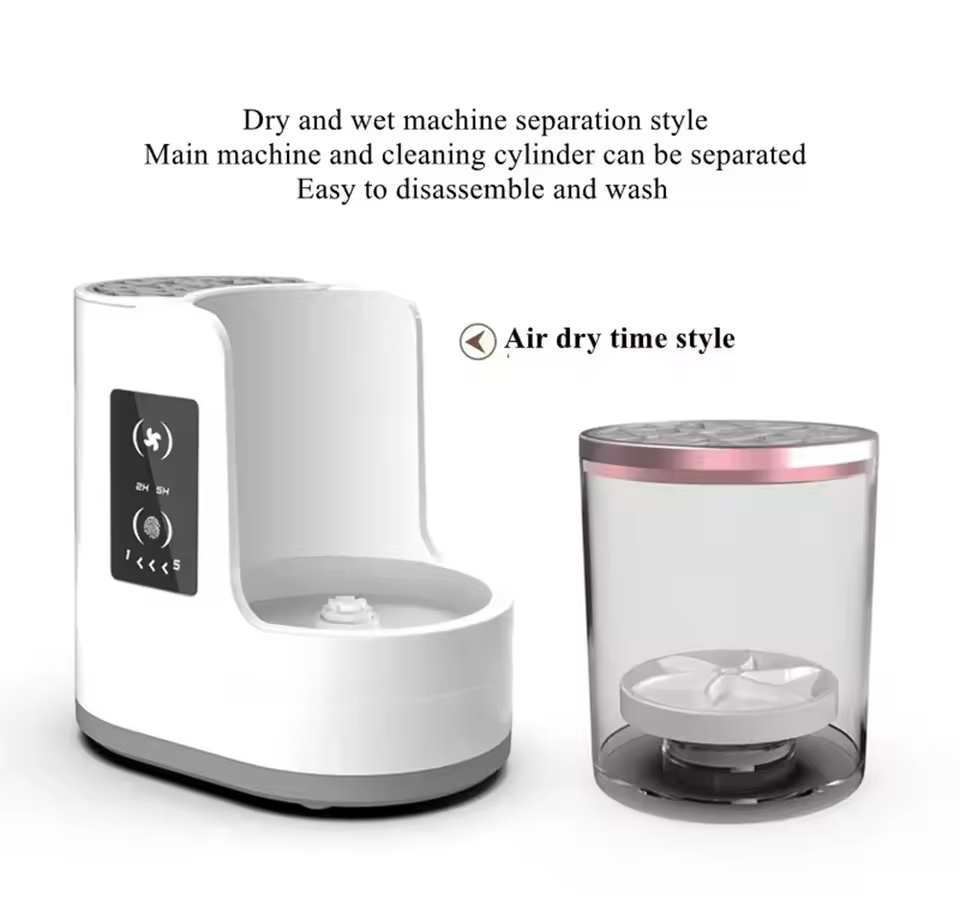 Upgraded Drying and Disinfecting Function: This unique cleaning station features a drying and disinfecting chamber, allowing brushes to be simultaneously dried and sanitized Efficient Cleaning: The make up brush clean machine has sufficient power. The high-speed rotating water flow, combined with the cleaning column and makeup brush cleaner solution and brush shampoo,brush soap cleanses,brush cleanser, can remove 98%of the makeup residue and dirt inside the cosmetic brush. Rest assured that our silicone cleaning bowl will not damage the shape and softness of your precious makeup brushes bristles Easy & Worry-Free Brush Cleaner: There is no need for assembly or batteries, and you don't need to worry about electric leakage. The make up brush cleaner features a one-button switch design, allowing you to simply connect the plug and press the switch to start makeup brush cleaning. You can flexibly adjust the angle of the makeup brushes when cleaning it by handhold Timing design: 1. Makeup brush cleaning function cleaning time for five minutes, five minutes to the end of the automatic stop cleaning (if not washed for five minutes can be repeated to open the cleaning) 2. Makeup Brush Dryer is divided into 2-hour timer and 5-hour timer drying, set the time to automatically stop drying (Note: It is recommended that the summer drying set to 2 hours, winter drying set to 5 hours) Portable and Travel-Friendly : Designed with portability in mind, our compact brush cleaner easily fits into your travel kit, efficiently cleaning and drying your brushes anywhere you go