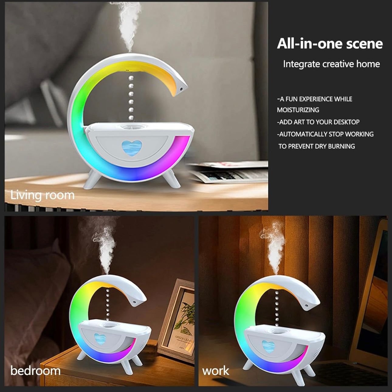 Description: Anti-Gravity Humidifier for Bedroom, featuring seven-color night light, fine spray cool mist, Bluetooth speaker, and waterless auto-off function, suitable for home, office, and baby bedrooms.