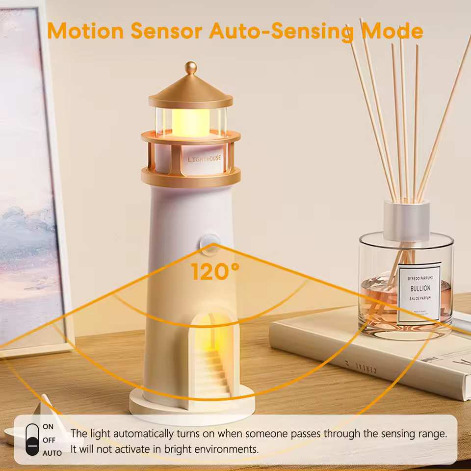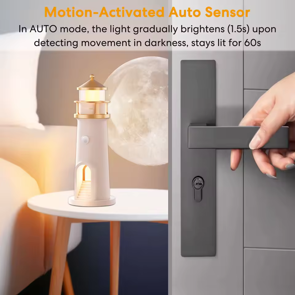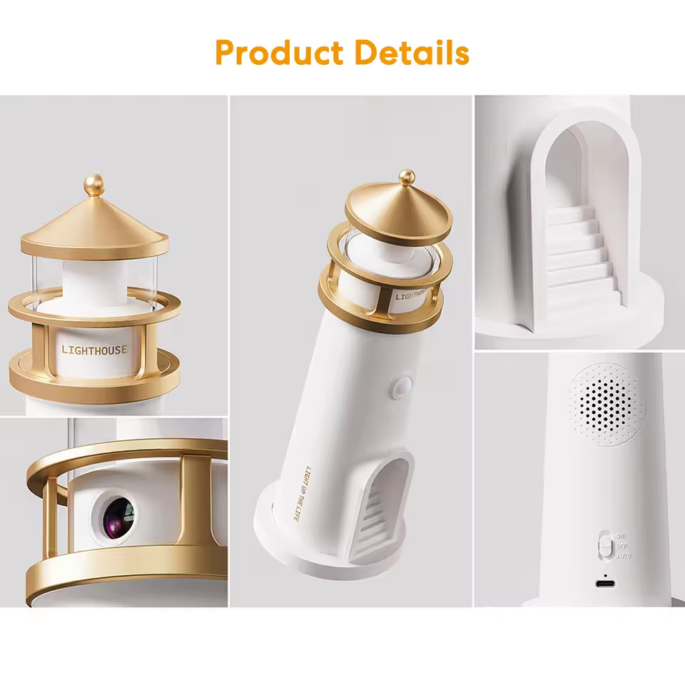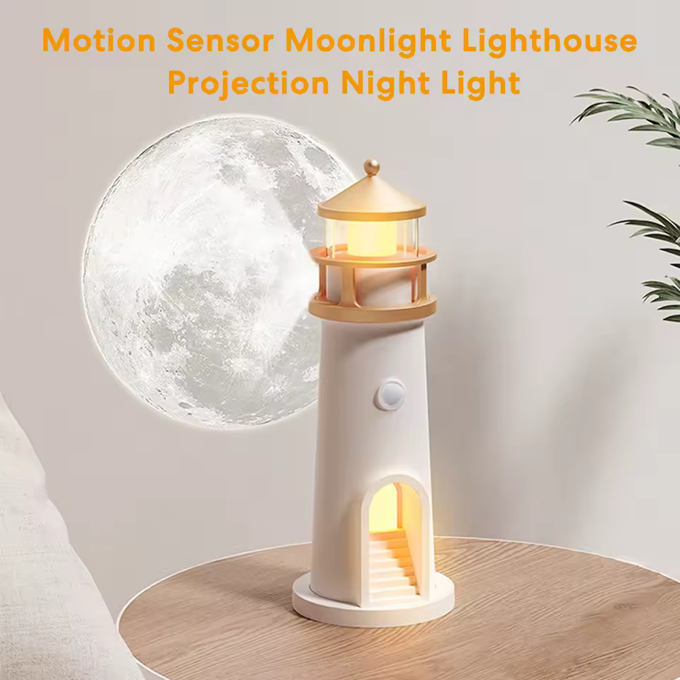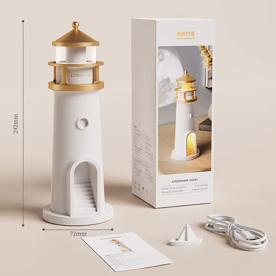 • Lighthouse Moonlight Projection Night Light: Serves as room decor while enhancing living spaces with a romantic, tranquil ambiance. • Motion Sensor Function: Equipped with a motion sensor, the lamp automatically illuminates when someone enters its detection range. • Extended Detection Range: Upon sensing movement in dark environments, the light activates for 1.5 seconds and remains on for 60 seconds. If movement is detected again within that 60-second period, the timer resets for another 60 seconds. After 60 seconds, the light turns off for 1.5 seconds. • Charging indicator light - red, charging on, fully charged off.