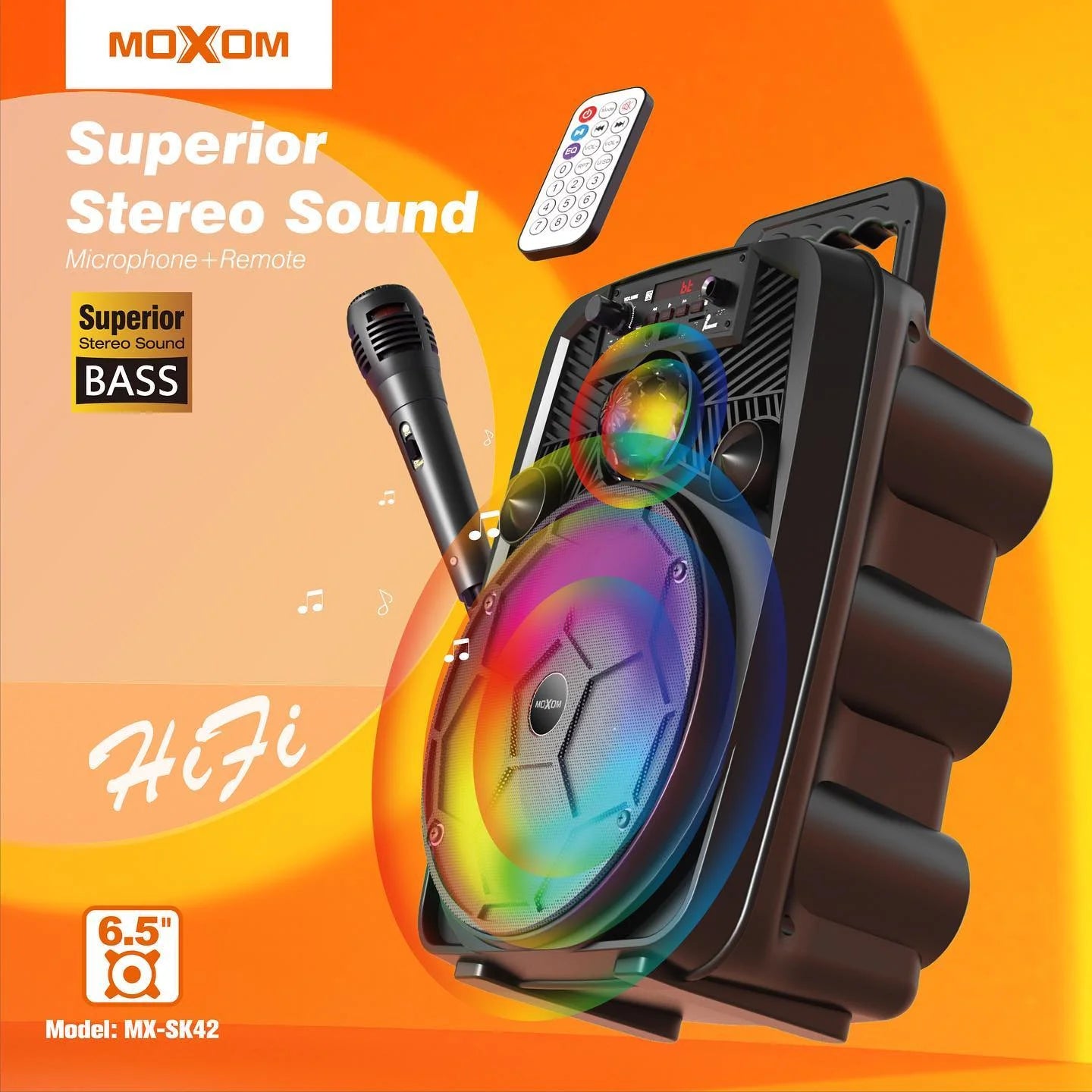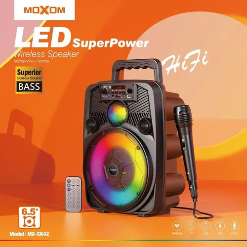 Moxom's new MX-SK42 Bluetooth Speaker is ideal for karaoke, featuring a powerful, large speaker and high-quality microphone. It provides up to 4 hours of continuous use. The speaker includes multiple ports: AUX, USB, micro SD, micro USB, and a 6.3 microphone port. It also features dynamic RGB lighting, a remote control, an LCD screen for commands, volume control buttons, and an FM radio for listening to stations.