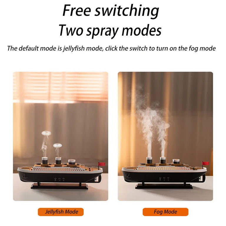 The standout feature of this diffuser is its misting outlets, designed to mimic the chimneys of the Titanic. This unique design adds a captivating visual element while delivering a soothing mist. Choose from continuous mist for a consistent aroma or periodic bursts for a more dynamic effect, transporting you to a place of calm and tranquility.