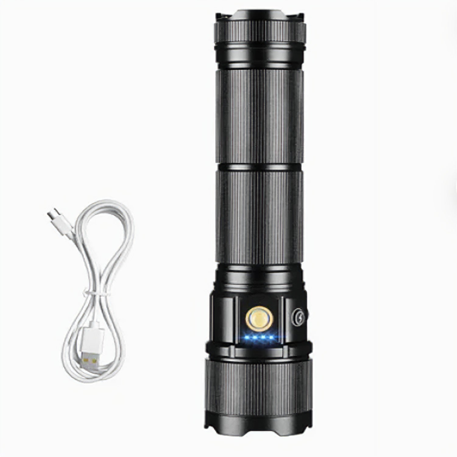 And the package includes 1 flashlight, 1 28,800 mAh rechargeable battery, a hand strap, and a USB cable 📦.